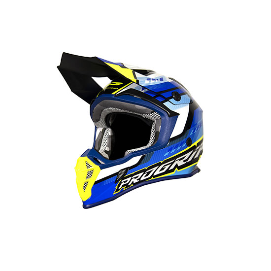 Casque cross Progrip 3180 en coque thermoplastique/ABS, homologué ECE 22.05, intérieur démontable antibactérien camo, ventilation optimisée et système d’extraction d’urgence des coussins de joues.