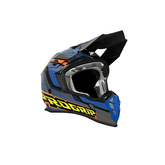 Casque cross Progrip 3180 en ABS, homologué ECE 22.05, léger (≈1295 g) et ventilé, intérieur démontable antibactérien, système d’enlèvement d’urgence des joues, adapté cross/enduro/quad/trial