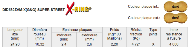 Référence DID530ZVM-X (G&G), 106 maillons, pas 530 (5/8″ x 3/8″).
