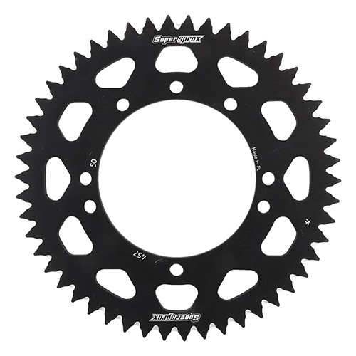 Couronne aluminium 50 dents Supersprox RAL-457:50-BLK, compatible Kawasaki KX85 (17”/14”) 2001–2023, en aluminium 7075‑T6 anodisé noir pour transmission légère, durable et nettoyage autonettoyant.