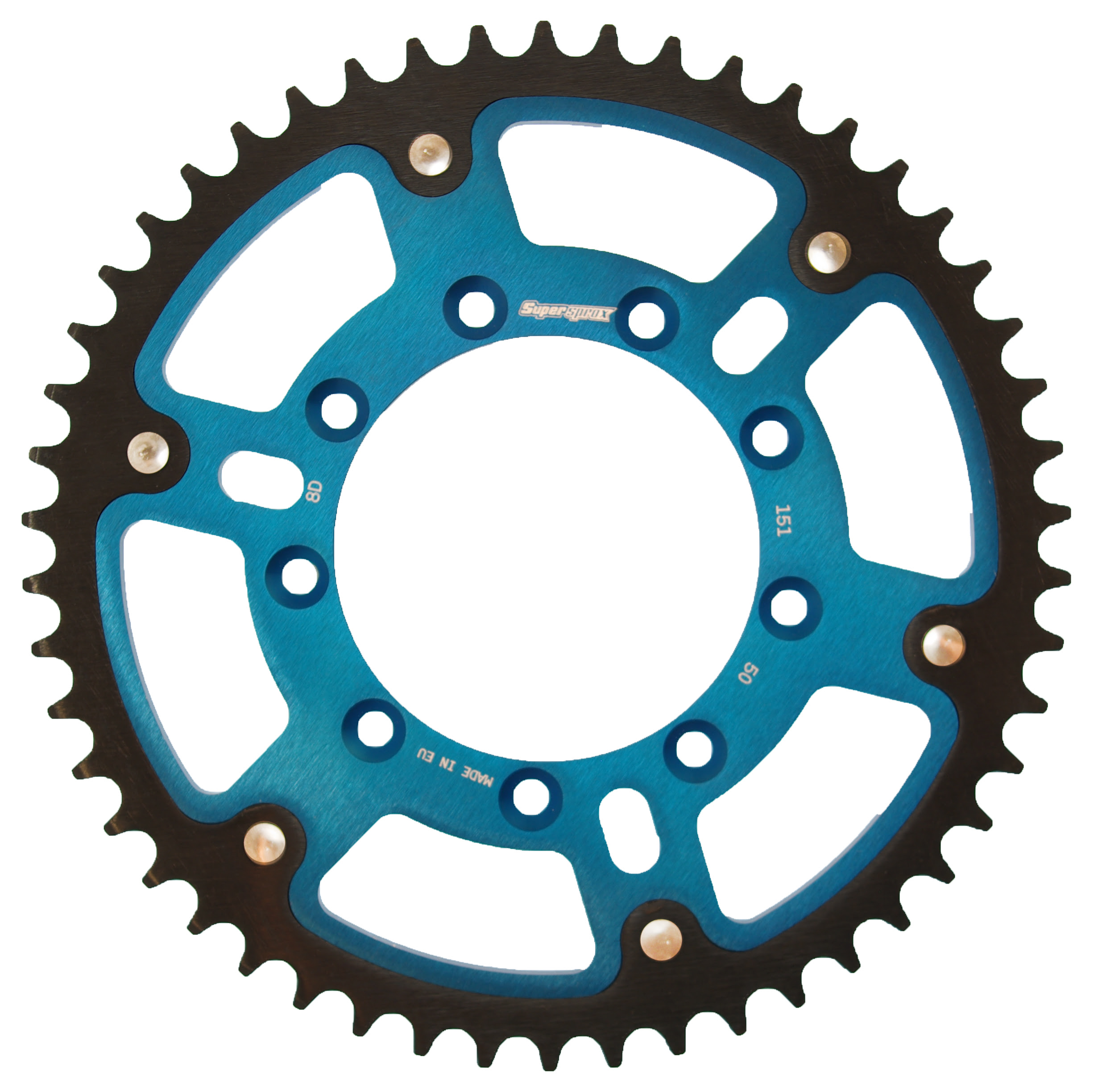 Couronne Supersprox SPX Stealth 50 dents (réf. 151:50-BLEU), conception hybride aluminium/acier pour transmission moto, légère et durable, adaptée usage intensif et disciplines extrêmes (rallye, enduro, motocross).