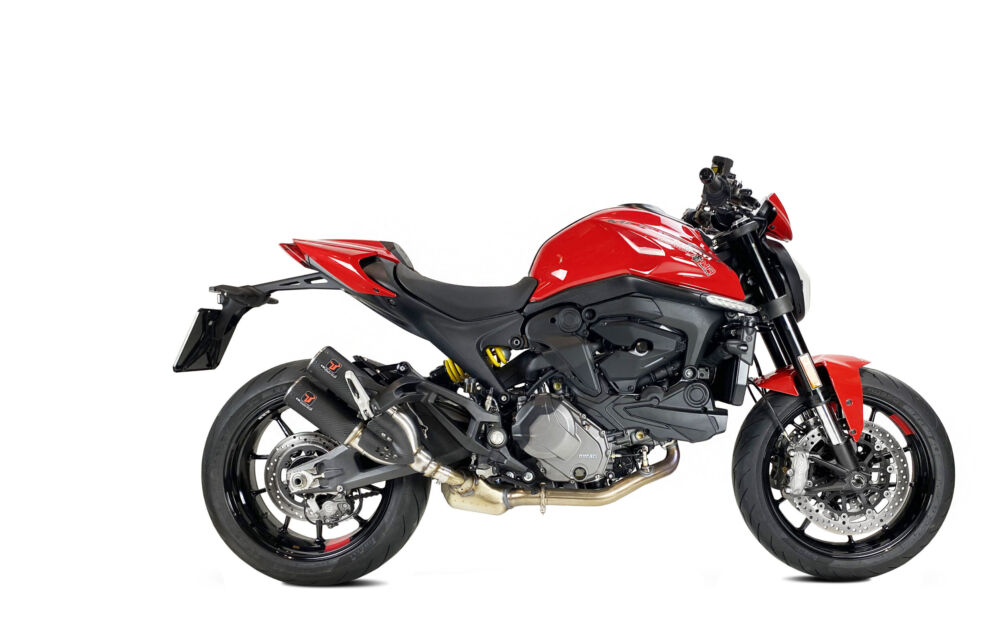 Silencieux racing DCX2 en carbone forged pour Ducati Monster 937 (2021‑2022), usage compétition non homologué, très léger (0,84 kg) et finition carbone avec raccords et grille AISI 304.