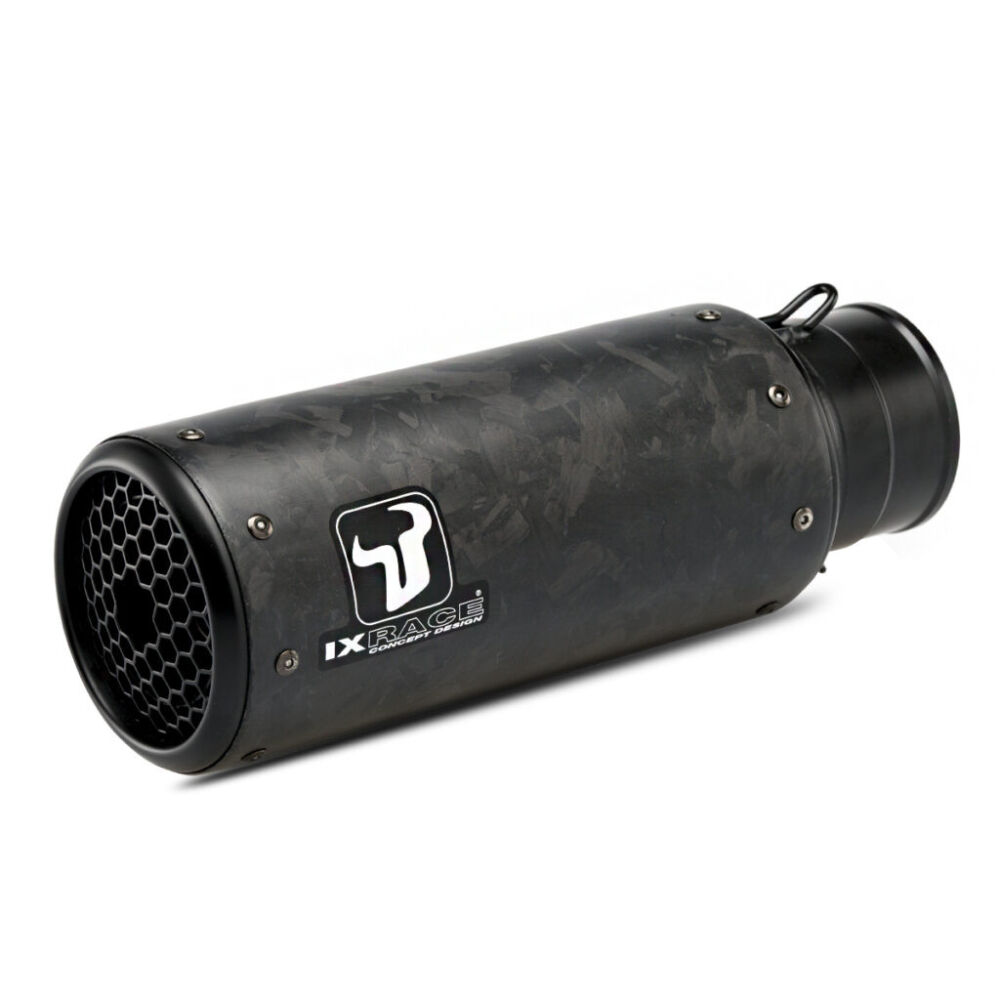DB killer inclus ; grille d’échappement en acier inoxydable style Moto GP ; rivets inox ; incrustation de la marque IXRACE dans le carbone.