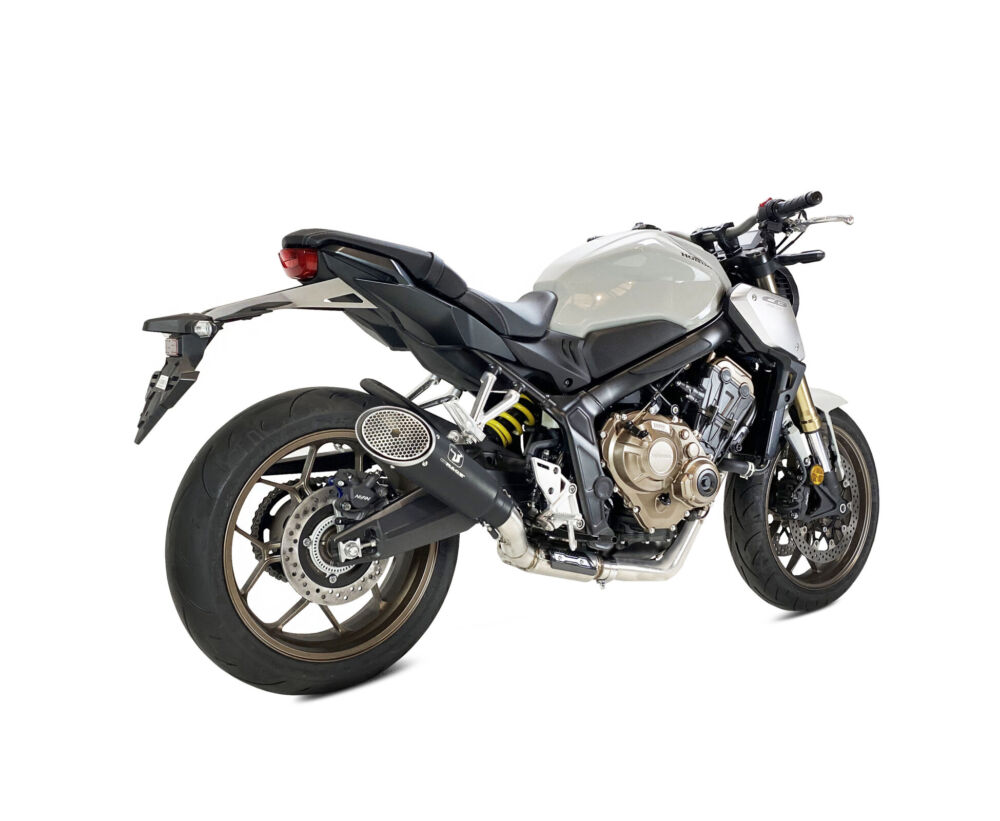Ligne d’échappement complète inox noir MK1 homologuée EURO5 pour Honda CB650R/CBR650R 2021–2023, 320 mm, 1,18 kg, fixation par ressorts et emplacement sonde lambda.