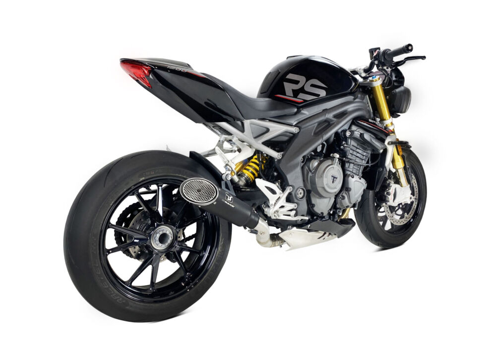 Silencieux racing MK1 en inox AISI304 finition noir mat, compatible Triumph Speed Triple 1200 RS (2020‑2023), 320 mm, 1,18 kg, db killer inclus non homologué.