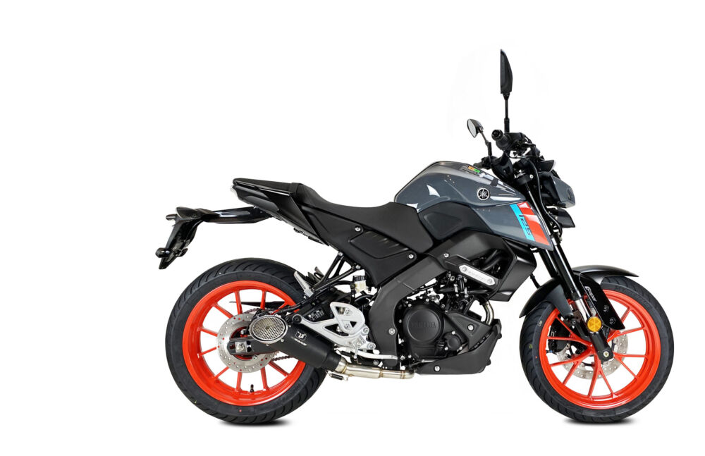 Ligne complète d’échappement inox noir IXRACE MK1 pour Yamaha MT‑125 (2021‑2023), non homologuée compétition, silencieux 320 mm, poids 1,18 kg, db killer démontable, fixation par 2 ressorts AISI304.