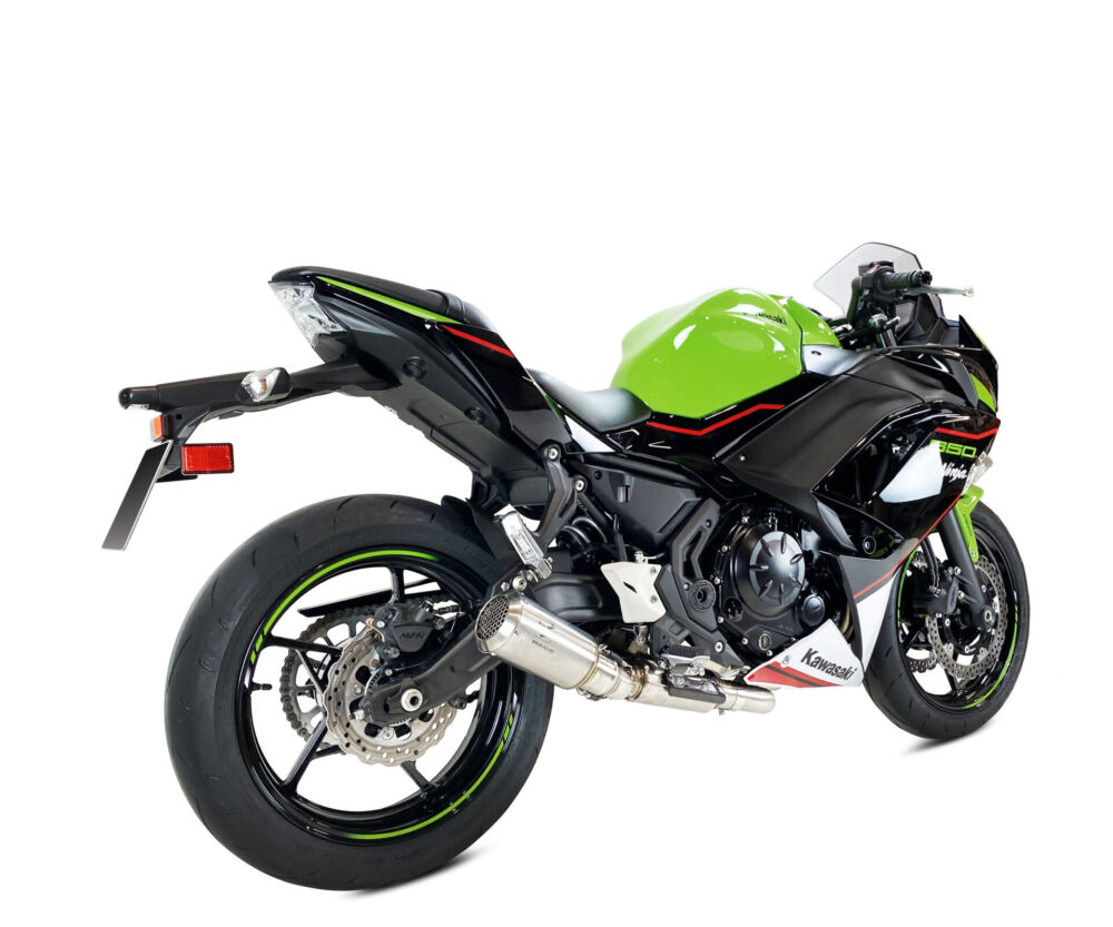 Ligne complète d’échappement inox AISI304 homologuée EURO5 pour Kawasaki Z650 (2021–2022), finition satinée, silencieux 180 mm avec db-killer et embout Moto GP AFS, poids 0,9 kg.