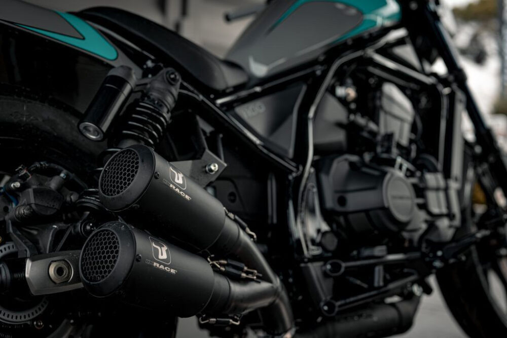 Double échappement inox noir IXRACE pour Honda Rebel CMX 1100 (2021–2023), non homologué, léger (1,8 kg la paire), finition céramique haute température et sortie AFS anti-flamme.