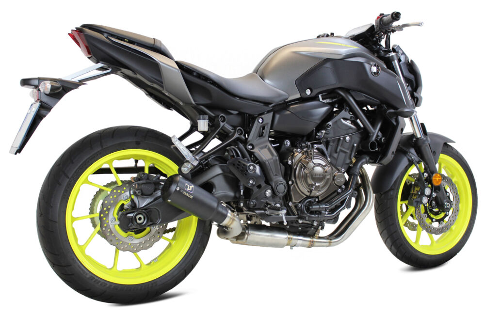 Ligne d’échappement complète homologuée EURO4 en inox AISI 304 finition noir mat, compatible Yamaha MT‑07 2014–2020, embout 180 mm et 0,9 kg, installation par ressorts, db‑killer inclus.