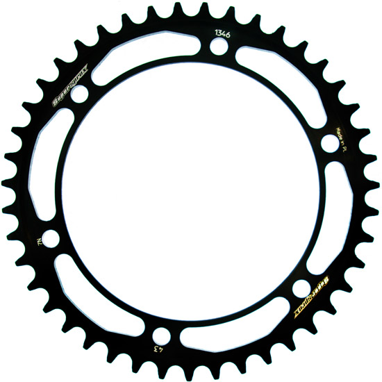 Pignon en acier; couronne en aluminium/acier avec finition noire; chaîne en acier traité.