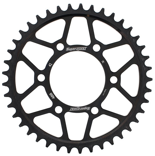 Chaîne : acier traité, 108 maillons, type ZJ/VX3. Pignon : acier, 16 dents, pas 530. Couronne : acier C50, 41 dents, pas 530.