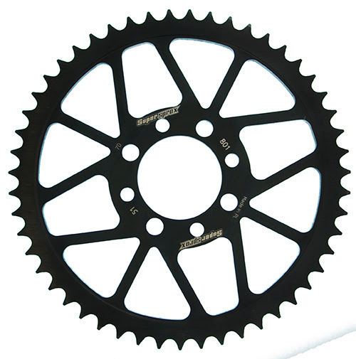 Chaîne en acier renforcé (DID 420D), pignon en acier traité, couronne en acier C50.