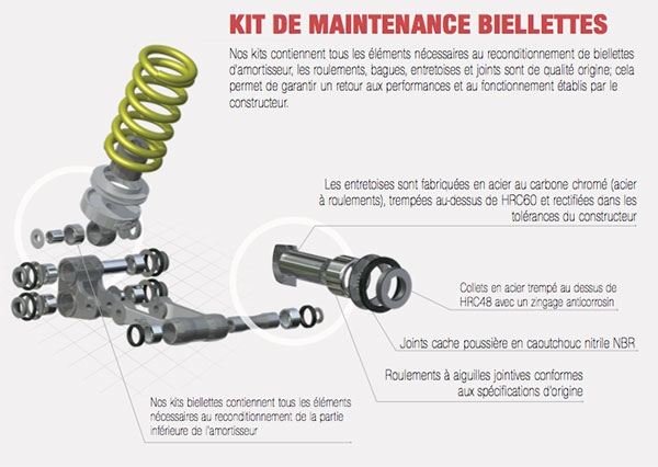 Contient tous les éléments permettant la réfection de la partie inférieure de l’amortisseur.