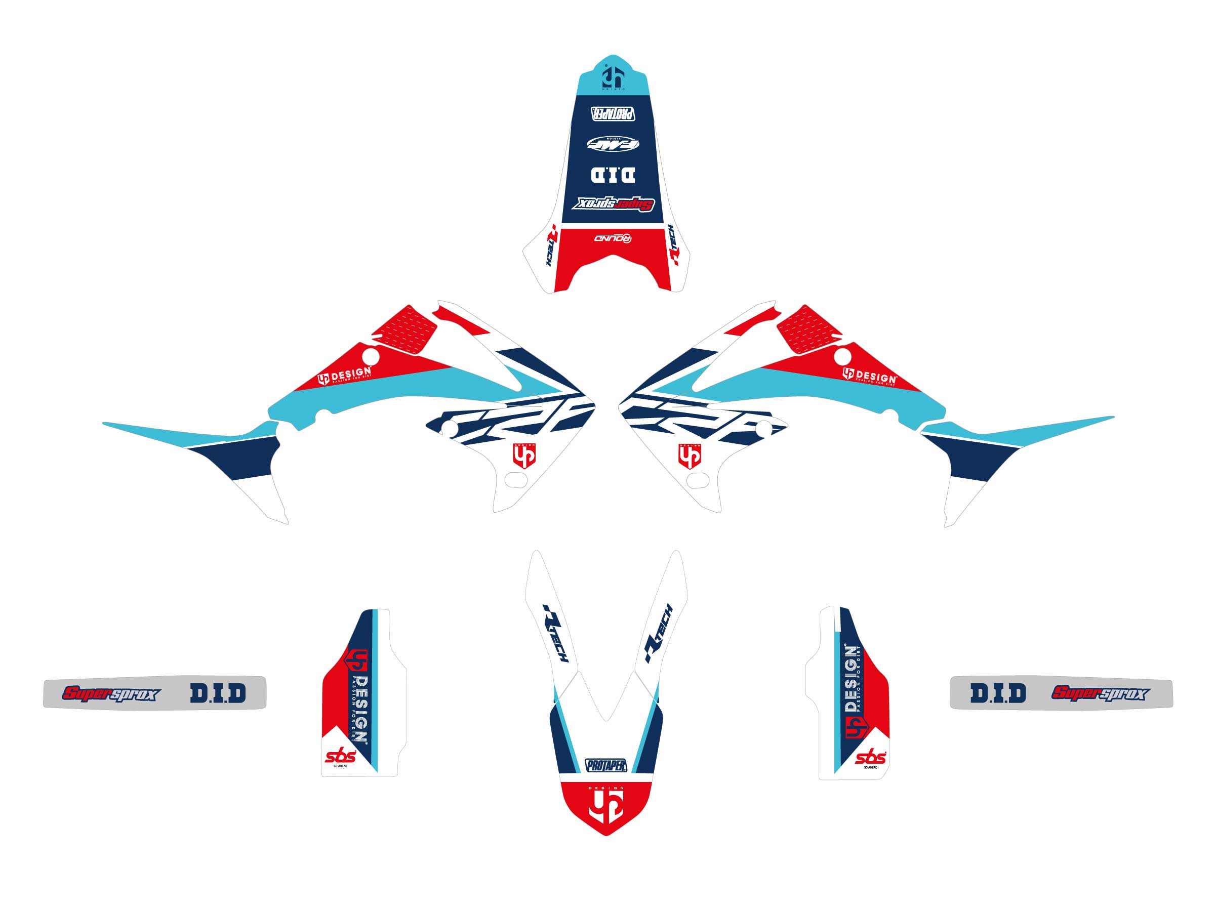 Stickers pour garde-boue avant et arrière, décorations pour les ouïes de radiateur, habillage des fourreaux de fourche, graphismes pour bras oscillant et autocollants pour boîtes à air.
