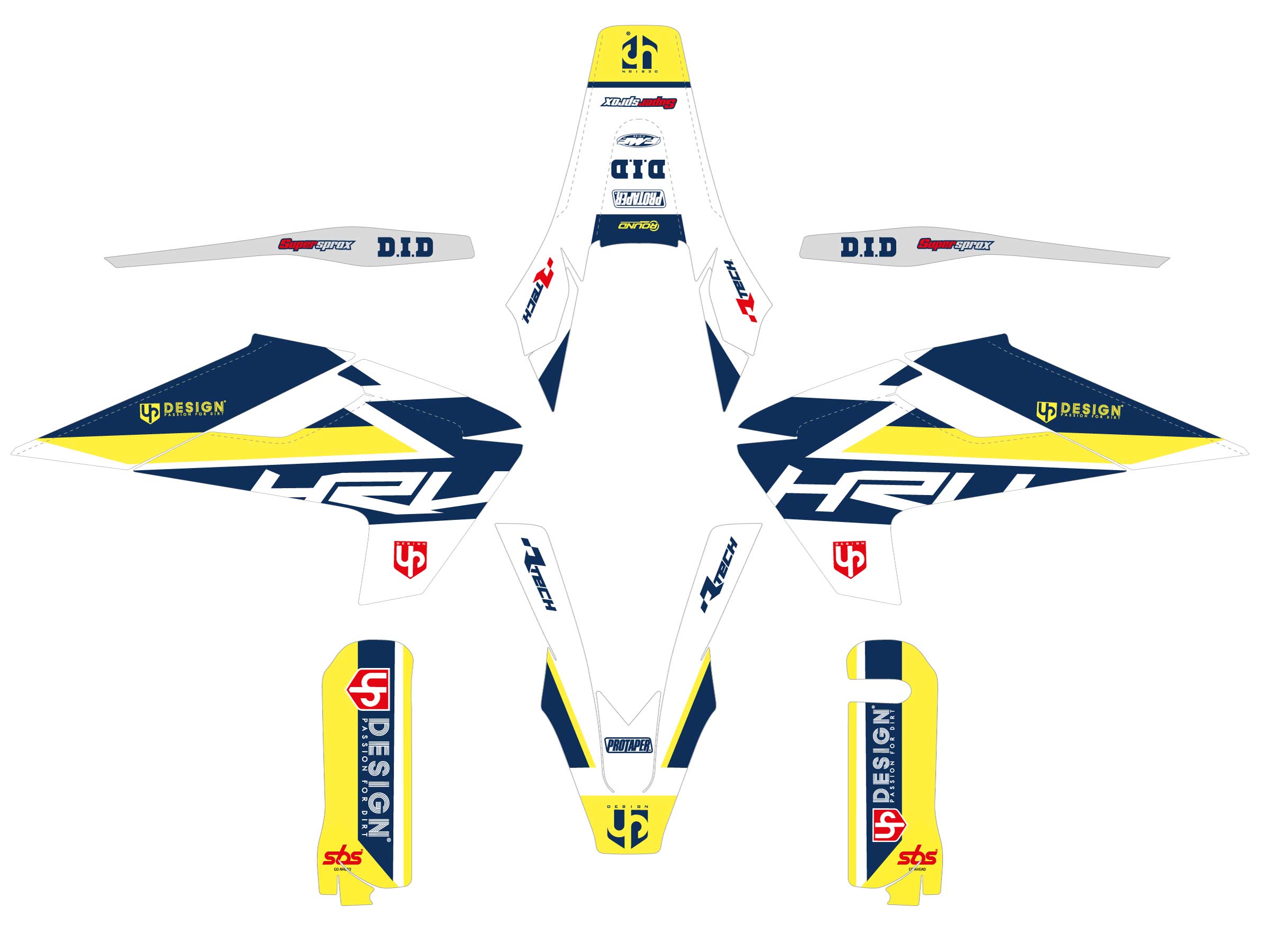 Kit déco en vinyle technique UP Design pour Husqvarna TE250/TE250i/TE300/TE300i (2017‑2019), thermoformable et repositionnable, conçu pour protéger et moderniser les plastiques tout-terrain.