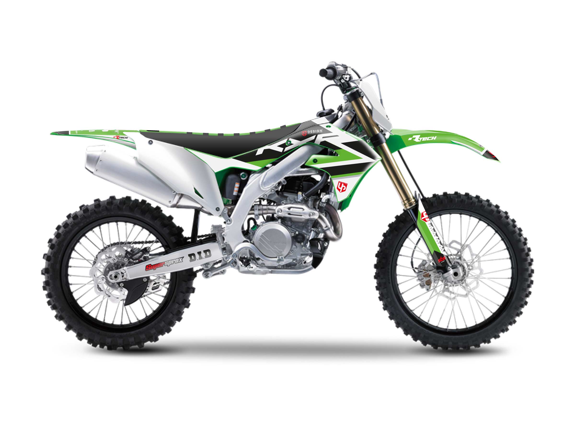 Kit déco en vinyle thermoformable UP fabriqué en France par Kutvek, compatible Kawasaki KX 450 F (2013–2015), finition haute définition pour une pose facile et tenue tout‑terrain.