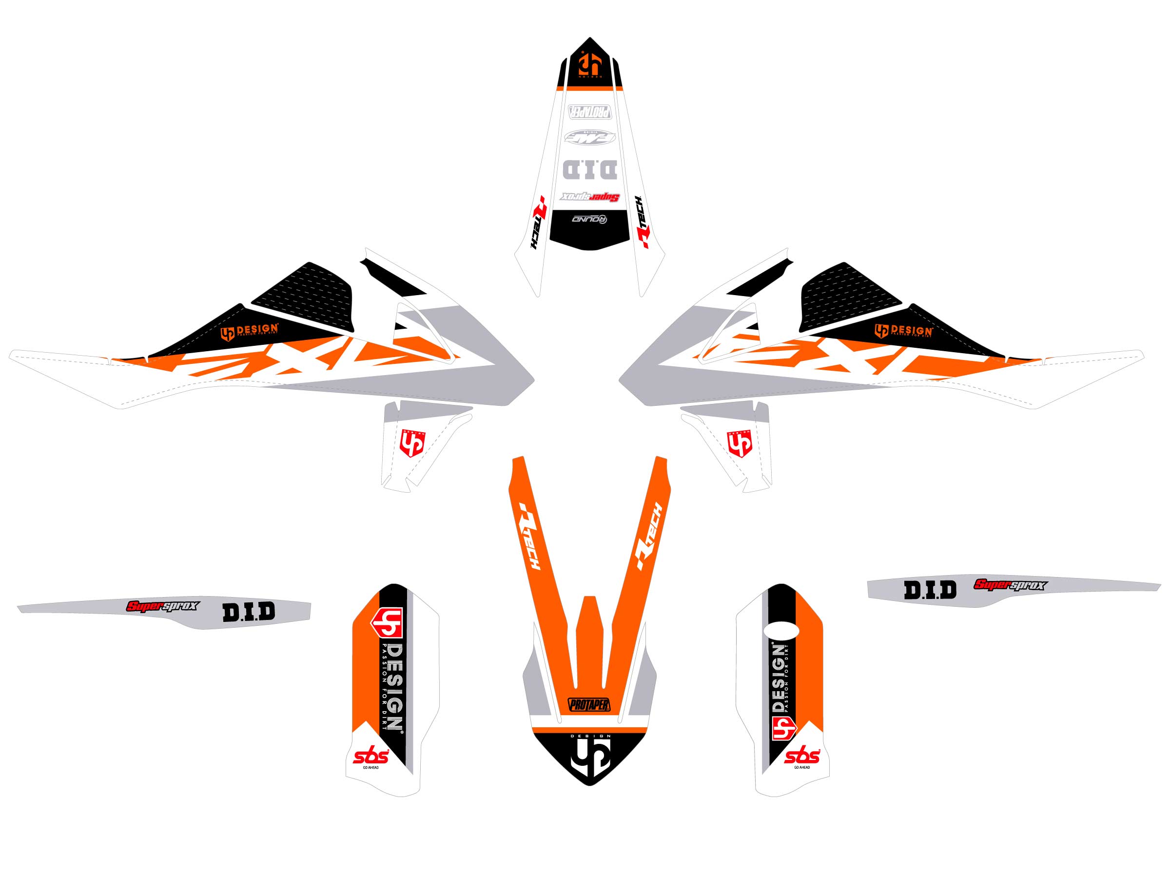 Kit déco vinyle UP ROUND orange pour KTM EXC / EXC‑F (2014–2015) comprenant garde‑boue, ouïes, protections fourche, bras oscillant et boîte à air, résistant et thermocollant pour usage enduro/motocross.