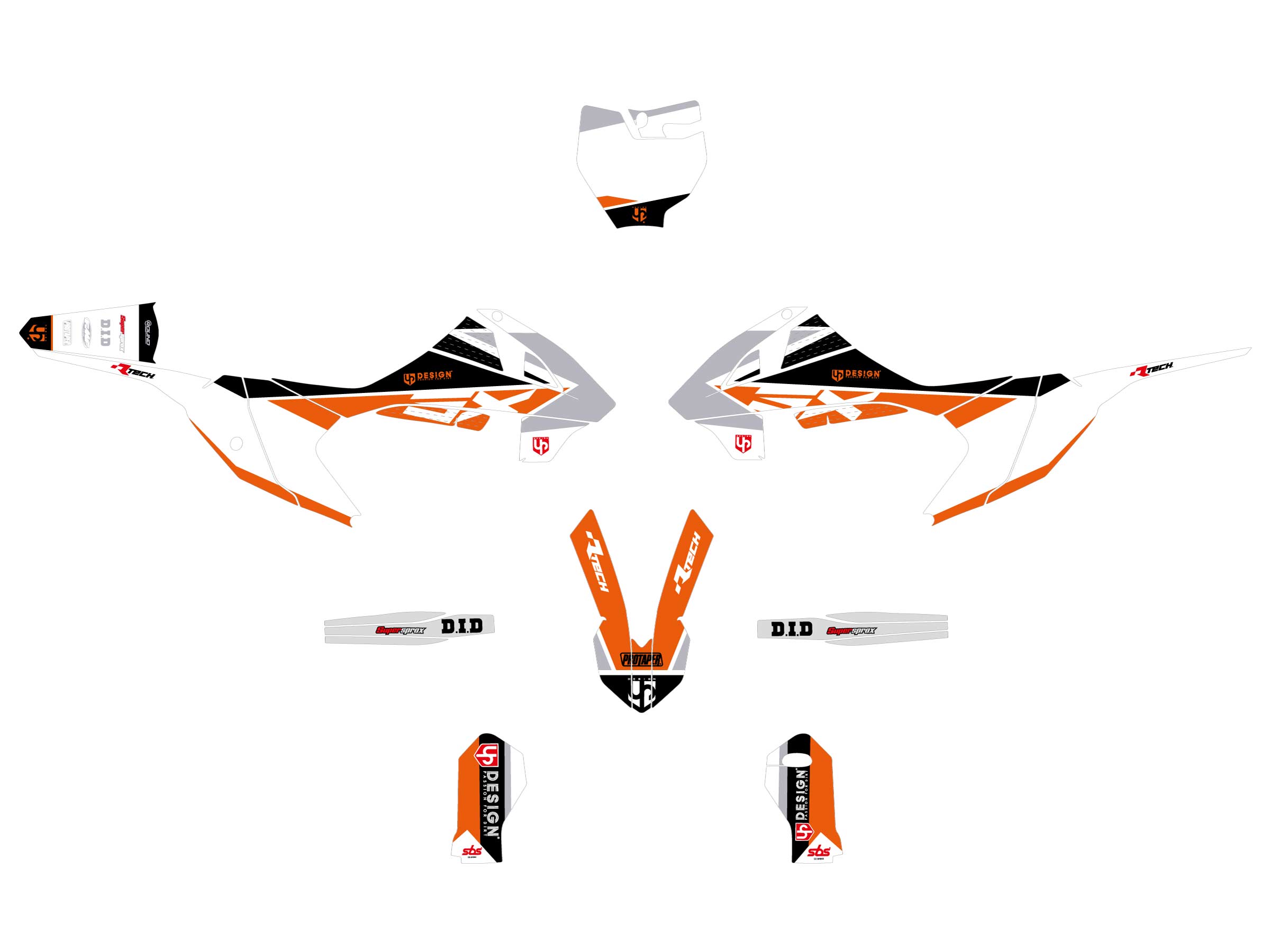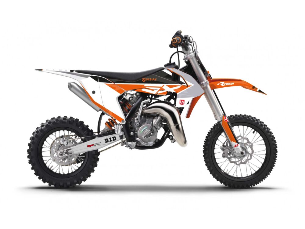 Kit déco en vinyle technique pour KTM SX 65 (2016–2018) comprenant stickers pour garde-boues, ouïes, protections de fourche, bras oscillant et boîtes à air, conçu pour usage tout‑terrain durable.