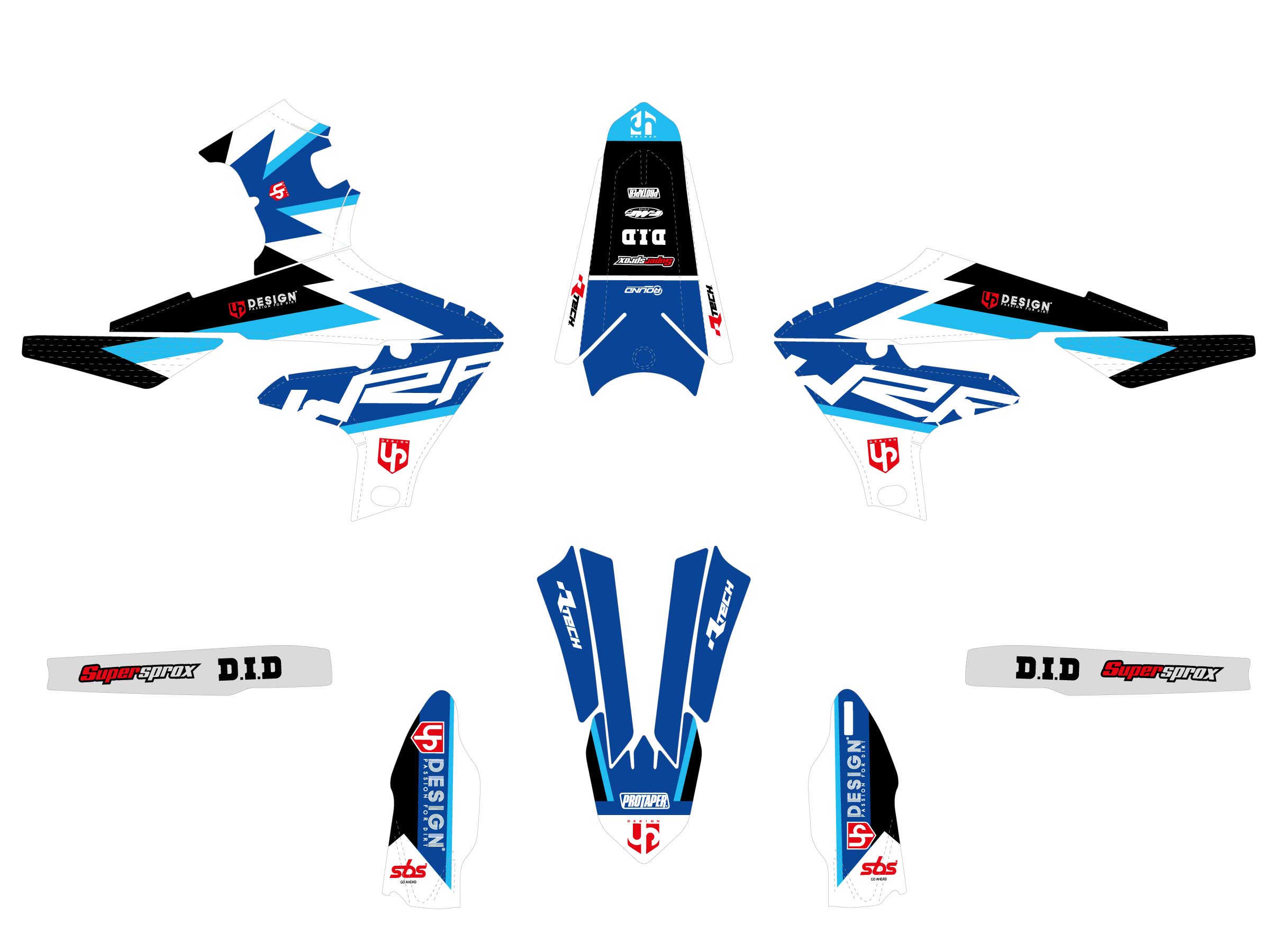 Le kit couvre : garde-boue avant, garde-boue arrière, ouïes de radiateur, protections de fourche, bras oscillant et boîtes à air.