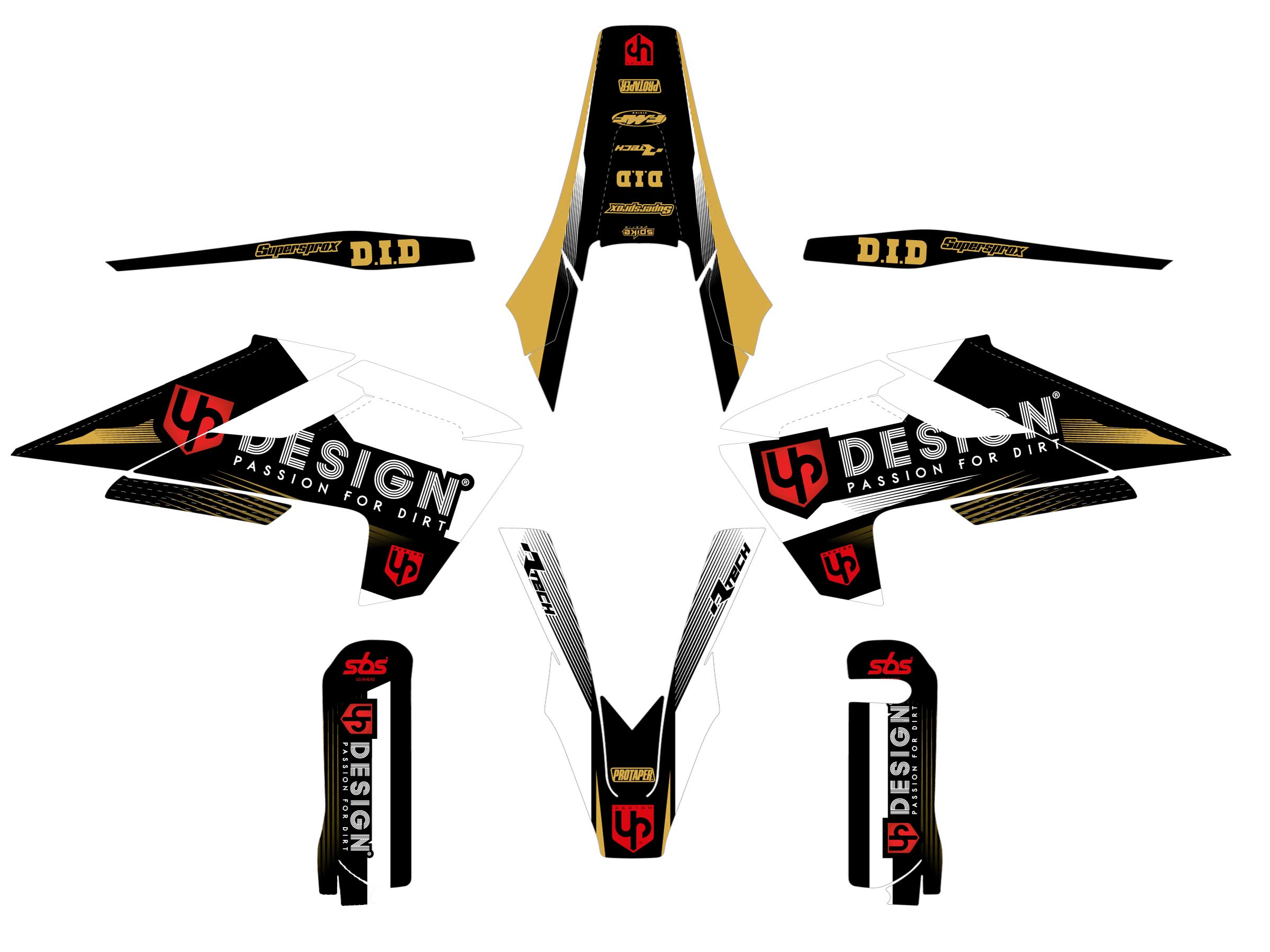 Selon le modèle, le kit comprend décorations pour les garde-boue avant et arrière, stickers pour les ouïes de radiateur, habillage des protections de fourche, décos pour bras oscillant et stickers pour la boîte à air.