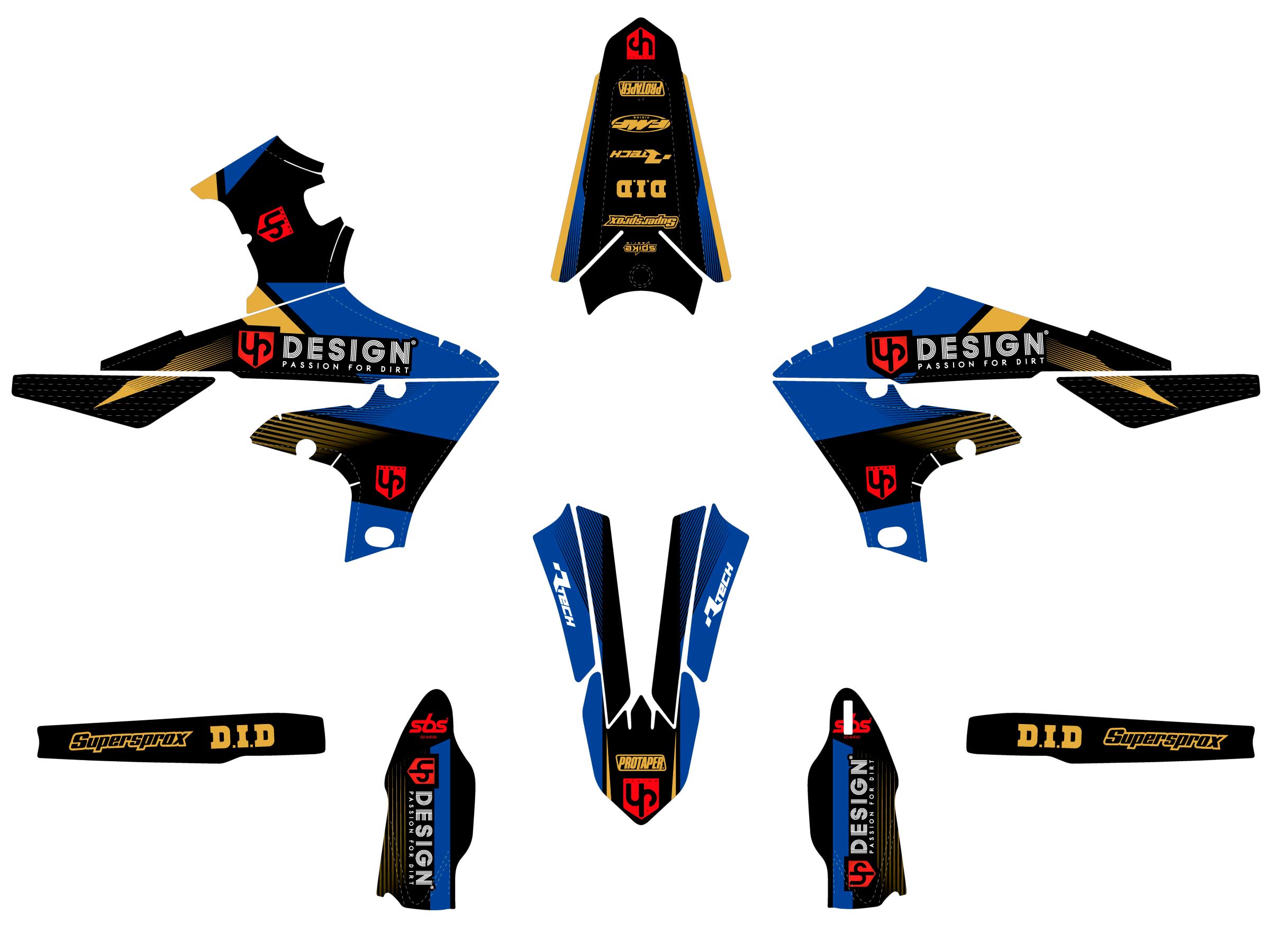 Kit déco en vinyle thermoréactif UP SPIKE noir-bleu pour Yamaha YZ250 F (2019–2022) couvrant garde-boue, ouïes, protections et bras oscillant, résistant UV, boue et frottements, pose facile et repositionnable.