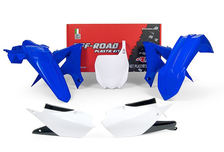Kit plastique 5 pièces R’Tech en polypropylène flexible, finition brillante anti-rayure, comprenant garde-boues, ouïes radiateur, plaques latérales et plaque numéro, compatible avec les modèles concernés pour remplacement.