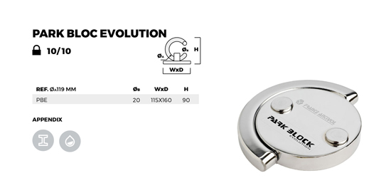 Le point fort du modèle PARK BLOC Évolution repose sur sa bague épaisse et relevable, dont l’ingéniosité garantit une fixation solide à tout antivol compatible. Une fois relevée, la bague atteint une hauteur de 90 mm, ce qui permet de faire passer l’anse d’un cadenas en U ou la boucle d’une chaîne de grande section.