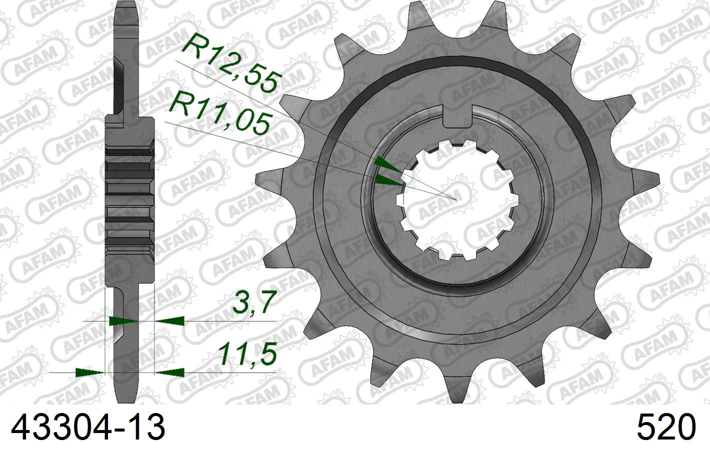 Pignon de transmission AFAM 520 (13 dents) en acier haute résistance, conçu pour motocross et enduro avec structure anti-boue pour une meilleure tenue à l’usure et une durée de vie accrue du kit chaîne.