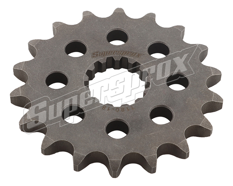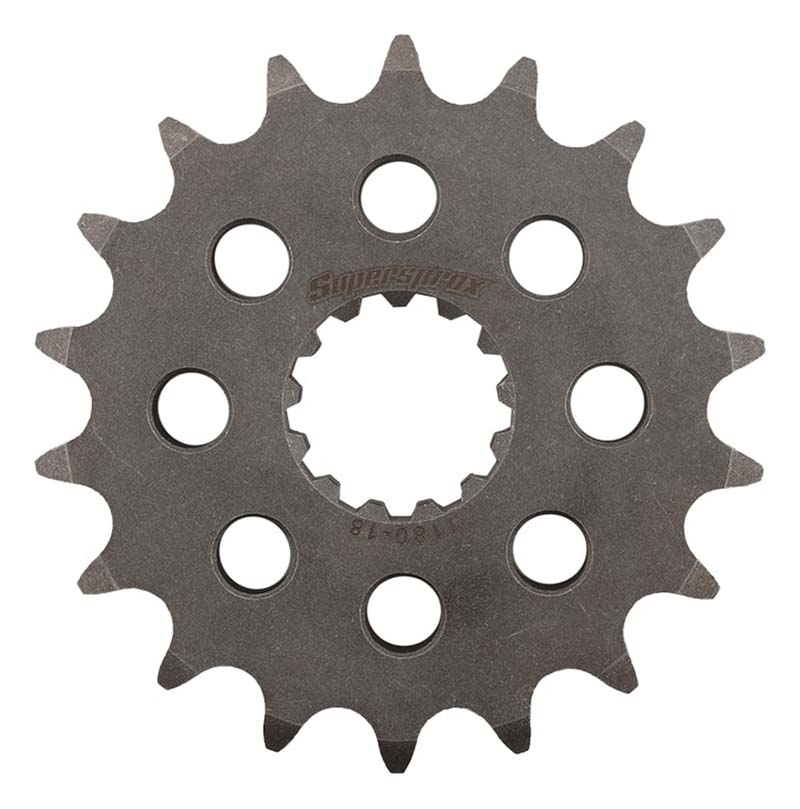 Pignon de sortie Supersprox PS80018 en acier SCM45 18 dents pas 530, compatible notamment Triumph Daytona, Speed Triple et Tiger (1994–2020) pour améliorer durabilité et réponse de la transmission.