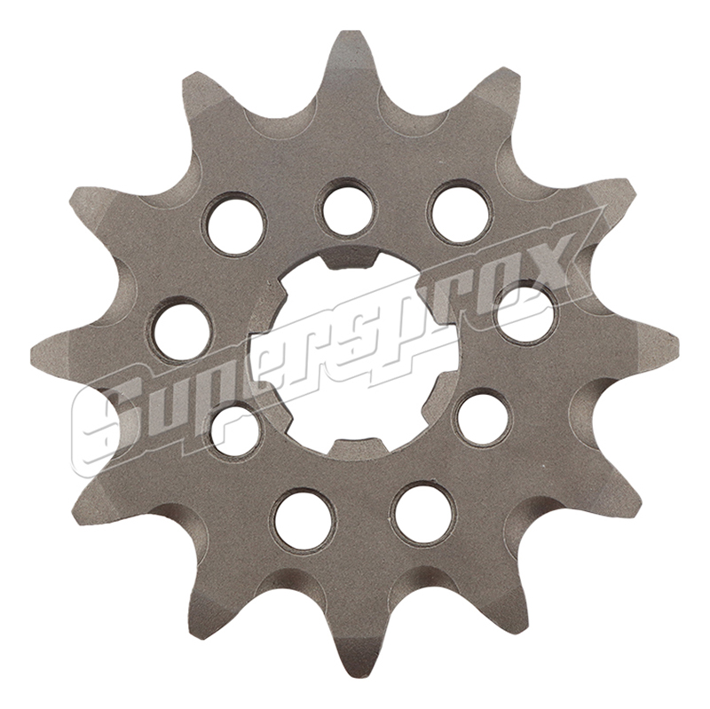 Pignon de sortie de boîte Supersprox PE20112 en acier SCM45 traité, 12 dents pas 520, compatible Kawasaki KX125 (1994–2002). Conception ajourée légère améliorant l’évacuation de boue pour usage motocross.