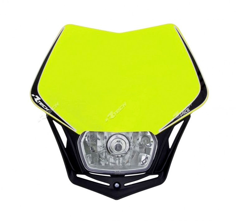 Plaque phare V‑Face en polypropylène souple R’Tech, compatible OEM pour motos tout‑terrain (motocross, enduro). Résistante aux impacts et aux UV, installation simple sans outils spécifiques.