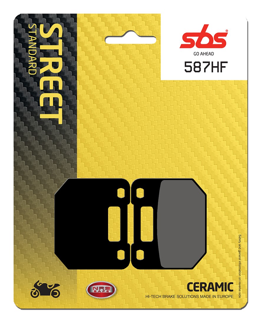 Plaquettes de frein organiques céramiques SBS 587HF pour Suzuki RG125 Gamma (1985–1991) et RG80 Gamma (1985–1995), conçues pour un freinage réactif et durable en usage urbain et routier.