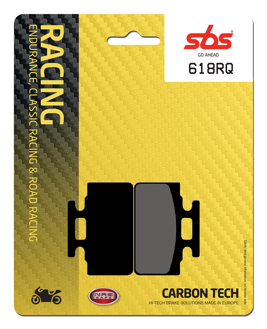 Plaquettes de frein arrière SBS 618RQ en composé carbone Road Racing Carbon, conçues pour usage course sur route et piste, offrant mordant élevé, dissipation thermique rapide et poids réduit pour meilleure maniabilité.