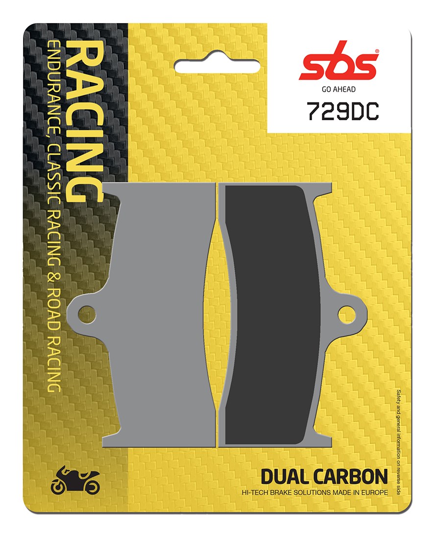 Plaquettes de frein avant Dual Carbon SBS 729DC, conçues pour usage compétition et journées sur circuit ; tenue en température élevée et excellente modulation pour Superbike, Supersport et track days.