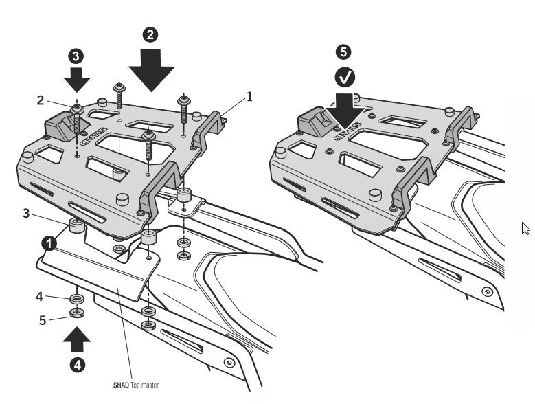 Platine aluminium découpée au laser, légère et robuste, servant de support pour top-cases SHAD (TR48, TR37, TR90, SH59X, SH58X, SH50, SH48); fournie avec quincaillerie de montage.