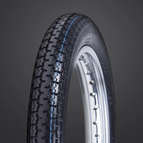 Pneu tube type 2,75-18 VRM 015 par Vee Rubber, conçu pour motos vintage et restaurations, offrant style rétro des années 50 et durabilité avec usure régulière pour trajets quotidiens.