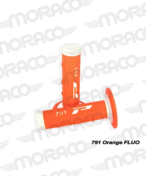 Poignées Off‑Road Progrip 791 en double densité, pour guidons Ø22/25 mm (longueur 115 mm, bout fermé) offrant meilleure absorption des vibrations et tenue de grip pour motocross/enduro.