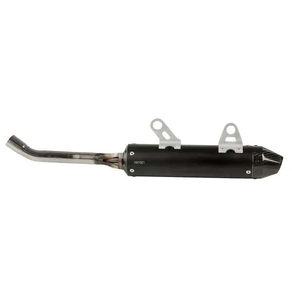 Silencieux 2T HGS en aluminium avec embout carbone, conçu pour GasGas MC125, Husqvarna TC125 et KTM SX125 (2023–2026) ; allège la machine tout en offrant robustesse et finition noire.