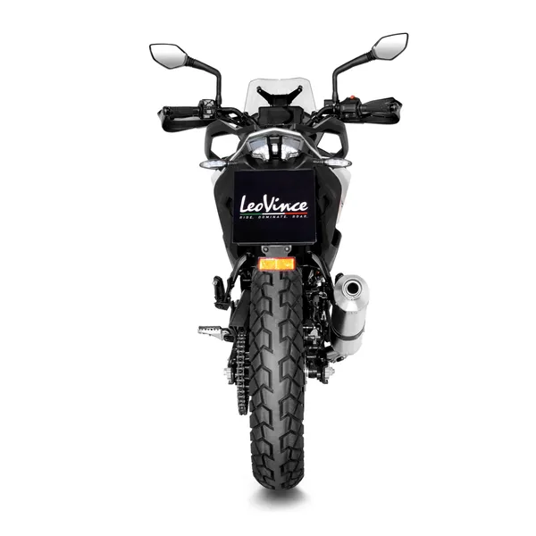 Inspiré par les exigences de la compétition, le LV One Evo affiche une finition soignée en inox aspect titane, idéale pour s’intégrer parfaitement aux lignes de la KTM Adventure 390. Son embout “slash-cut” asymétrique en carbone au design anguleux et compact souligne un caractère sportif affirmé. Le logo LeoVince gravé au laser renforce son esthétique premium.
