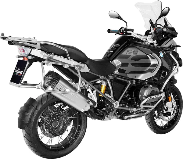 Silencieux slip-on LeoVince LV-12 en inox AISI 304 avec embout carbone, homologué ECE, compatible BMW R1200GS 2013–2020 (valises d’origine) pour un son plus grave et une meilleure durabilité.