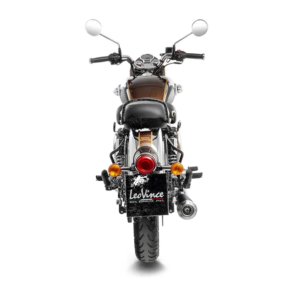 Silencieux slip-on LeoVince Classic Racer Black Edition en acier inox AISI 304, homologué ECE, pour Royal Enfield Meteor 350 et Classic 350 (2021–2024) — look rétro et sonorité feutrée.