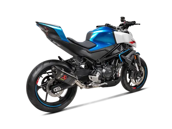 Silencieux Slip‑On en fibre de carbone pour CF Moto NK450 et SR450 (2024‑2025), montage plug‑and‑play côté droit, gain de poids important et sonorité sportive pour usage circuit uniquement.