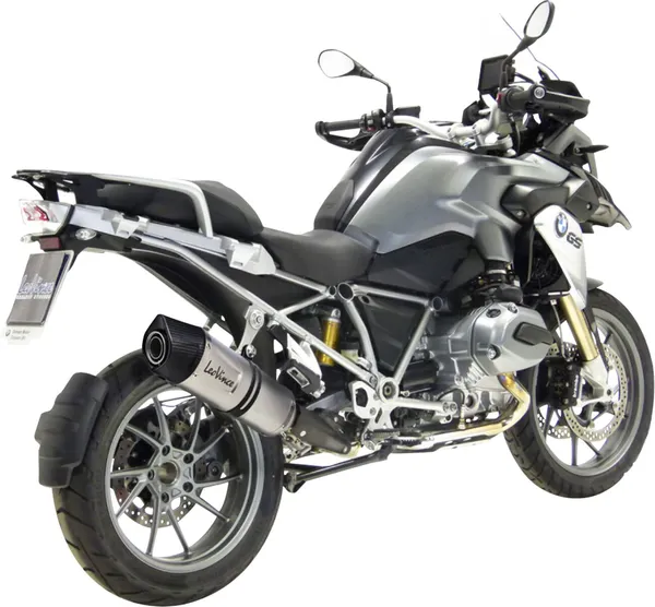 Silencieux slip-on LeoVince LV One Evo en acier inox aspect titane avec embout carbone, homologué ECE, compatible BMW R1200GS 2013–2016 (standard et Adventure) pour un gain de poids et meilleure sonorité.