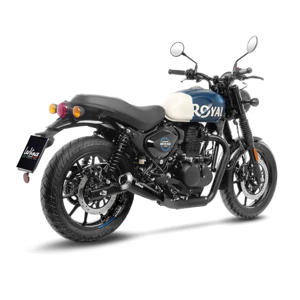 Silencieux slip-on LeoVince GP One en acier inox AISI 304, finition noir céramique, homologué ECE, pour Royal Enfield HNTR 350 (2023‑2024) — montage droit rapide, sonorité plus présente.