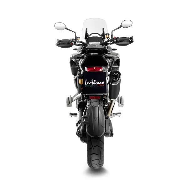 Silencieux Slip-On LeoVince LV-14 Black Edition en acier inox noir avec embout carbone, homologué ECE, pour Triumph Tiger 1200 (2022–2025) — améliore sonorité et look tout en restant compatible avec les sacoches d’origine.