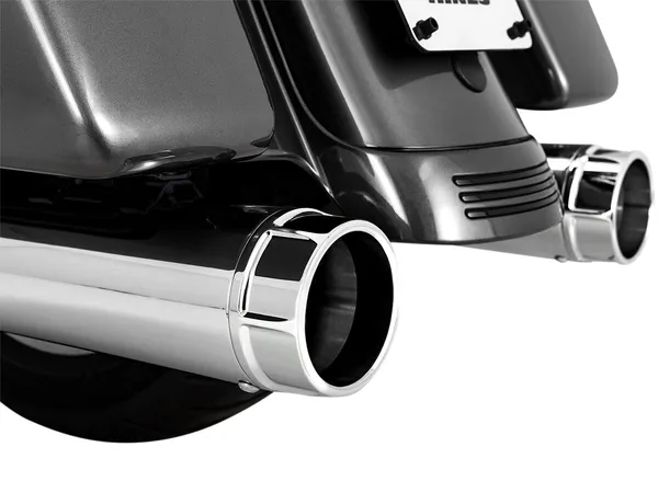 Fabriqués aux États-Unis, ces silencieux arborent un corps imposant en acier doux chromé de 4,5 pouces (11,5 cm de diamètre). Leur design droit (embouts straight-cut) et leurs embouts massifs taillés CNC dans l’aluminium leur confèrent une finition premium et durable. L’ensemble est sublimé par le logo Vance & Hines riveté, symbole de performance et de qualité.