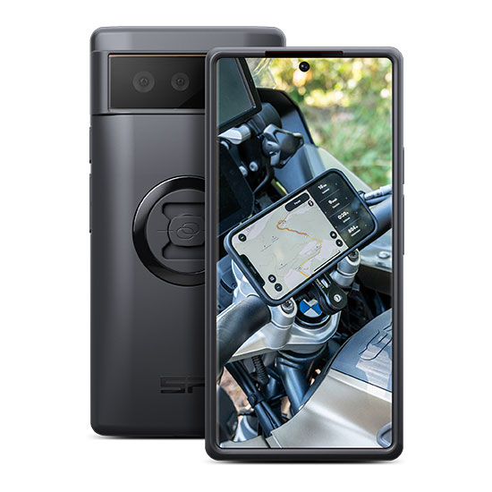 Support guidon moto SP‑Connect pour Google Pixel 6, fixation à rotation 90° avec étui étanche anti‑chocs ; permet un montage rapide et maintien sécurisé du smartphone en conduite.