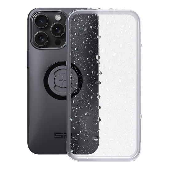 Housse Weather Cover SP‑Connect pour iPhone 15 Pro Max (à utiliser avec la coque SP‑Connect) offrant protection contre pluie, poussière, boue et projections tout en conservant la fonctionnalité tactile.